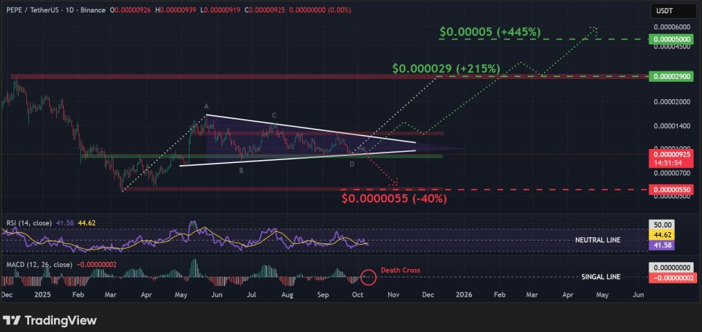 Actualmente, PEPE cotiza cerca de una zona clave de soporte en torno a $0.000009, que coincide con el límite inferior de su prolongado patrón de banderín alcista. Este nivel representa una confluencia crítica entre demanda y soporte técnico: la última línea de defensa antes de confirmar una posible ruptura bajista.
